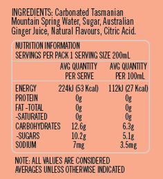 A generous amount of heat from real Australian ginger juice, just the right amount of sweetness from local cane sugar and the purity of Tasmanian mountain spring water all come together to create an uplifting and aromatic mixer, or delicious drink.
